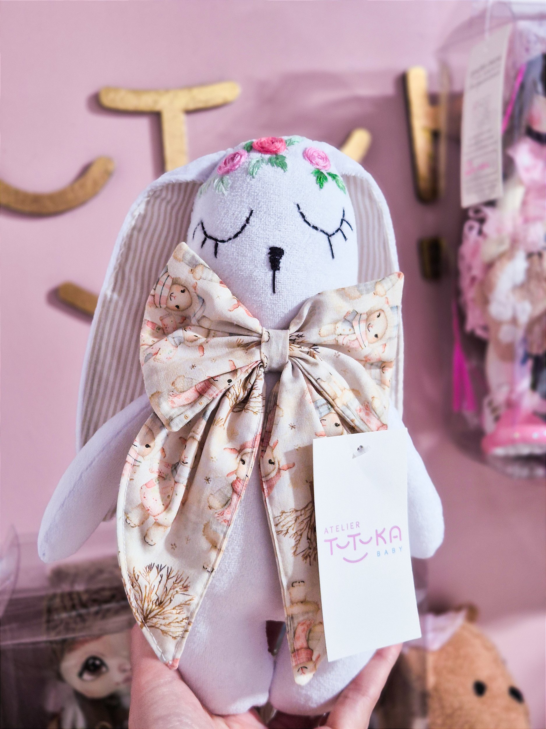 A Naninha Coelhinho  parte da Coleção Naninhas, e possui 25 cm, ideal para ser apoio e conforto para o recém nascido, possui 1 laço removível, bordado feito à mão, é um presente muito especial, a mamãe poderá retirar o laço para lavar.